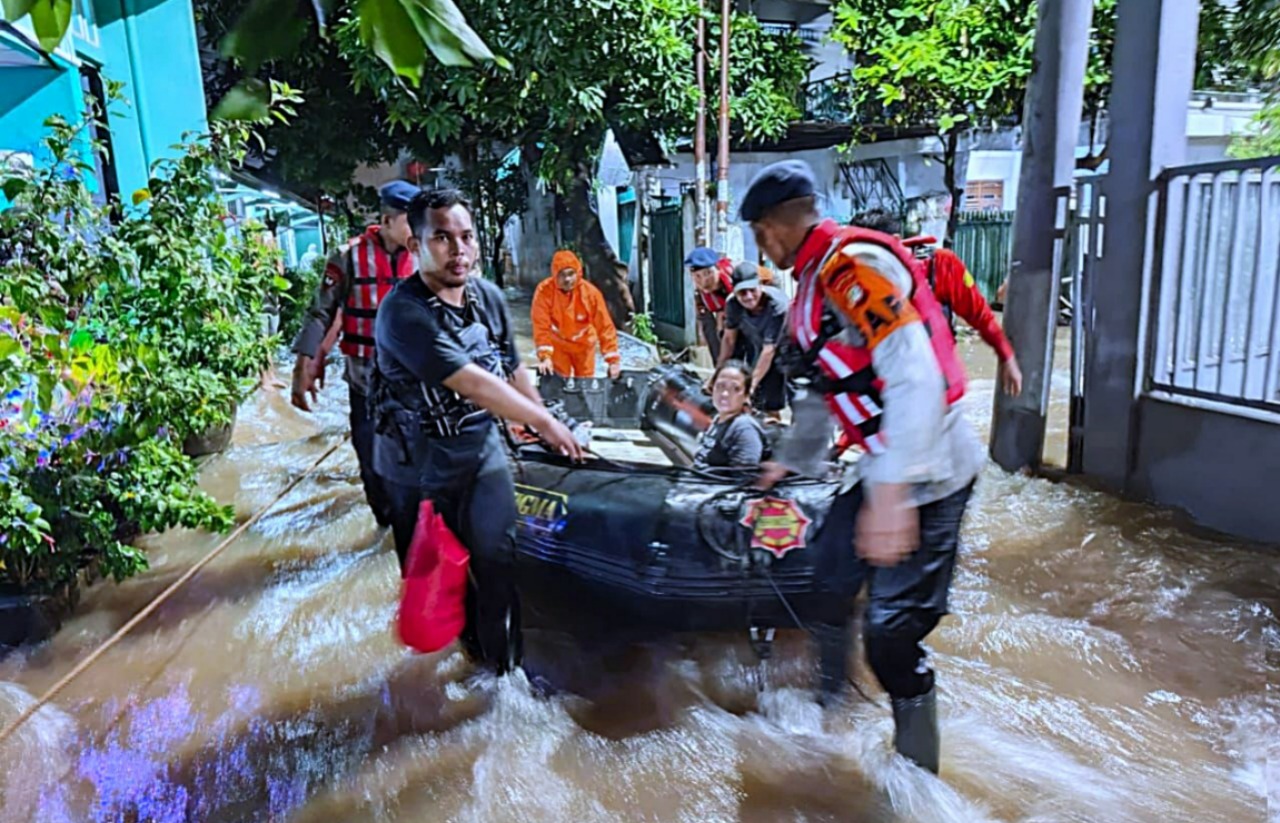 Brimob Polda Metro Jaya Laksanakan Patroli SAR Antisipasi Banjir dan Bantu Evakuasi Warga di Pondok Aren