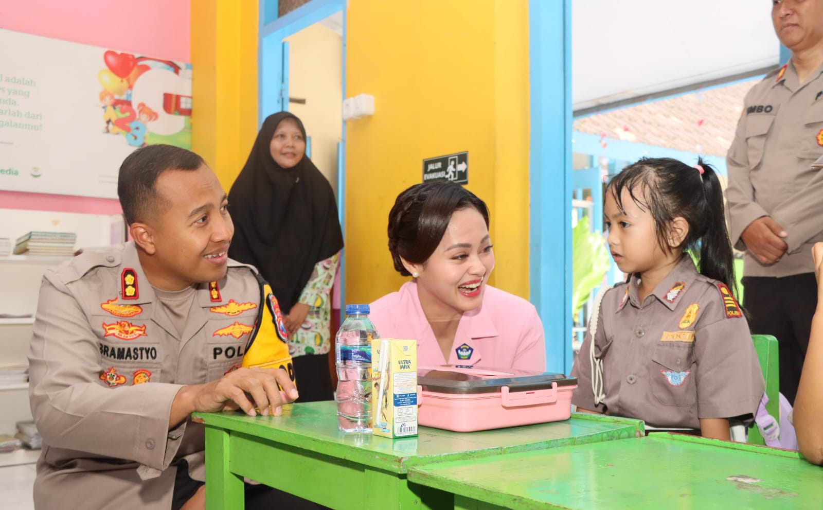 AKBP Bramastyo Priaji, S.H., S.I.K., M.Si didampingi Ny. Ratih Bramastyo Priaji berinteraksi langsung dengan anak-anak, menanyakan keseharian mereka, serta memberikan motivasi agar rajin belajar dan menjaga kesehatan.