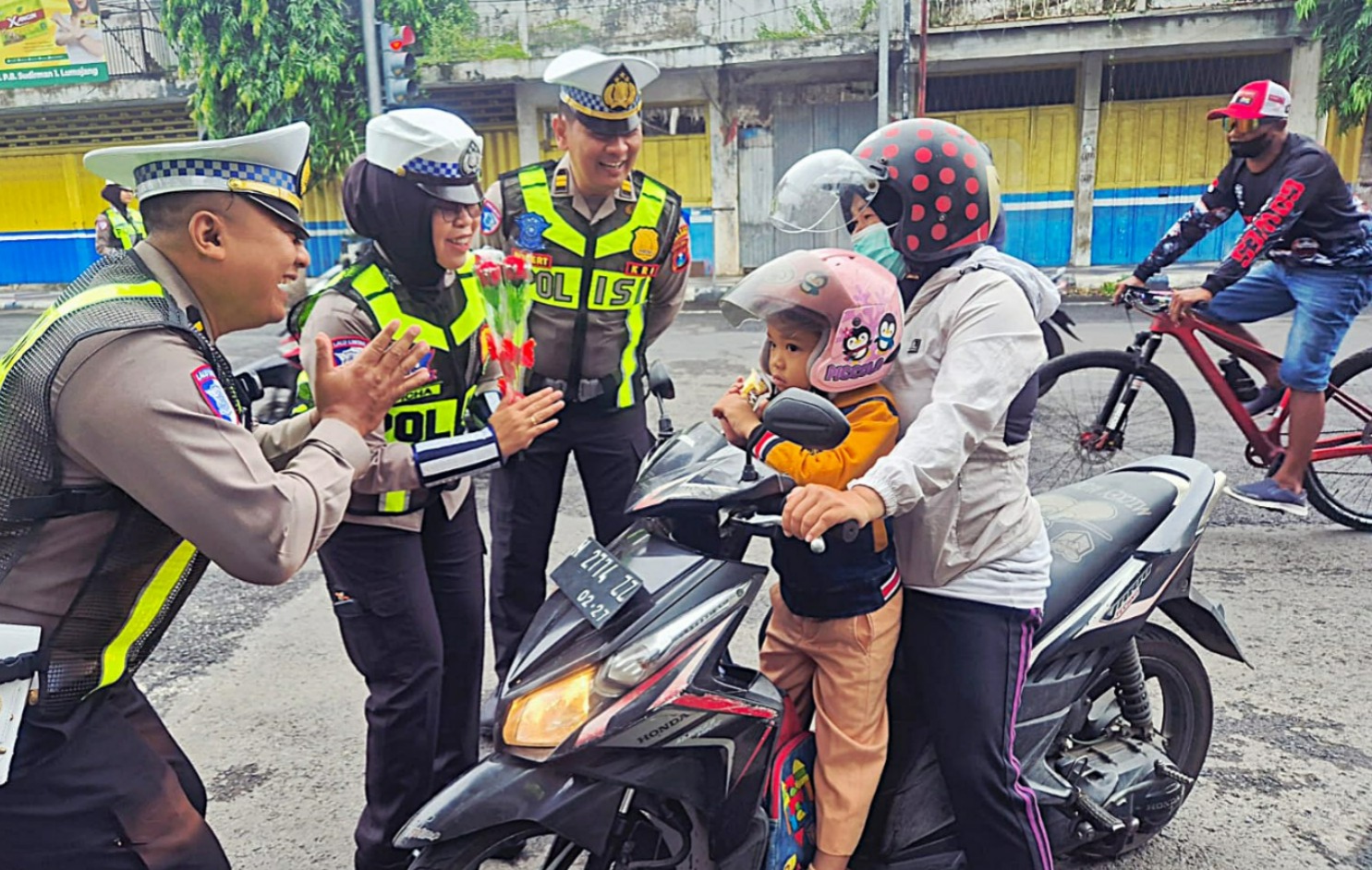 Pembagian bunga dan cokelat bentuk apresiasi ke pengguna jalan yang mematuhi peraturan lalu lintas, seperti menggunakan helm, melengkapi surat-surat kendaraan, dll