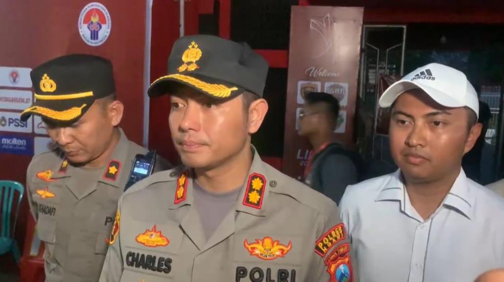 Kapolres Ngawi AKBP Charles Pandapotan Tampubolon, S.I.K., S.H., M.H., menghimbau masyarakat dan seluruh penonton serta suporter Liga 4 Indonesia, khususnya yang hadir di Stadion Ketonggo Kab. Ngawi untuk tetap tertib dan menjaga keamanan.
