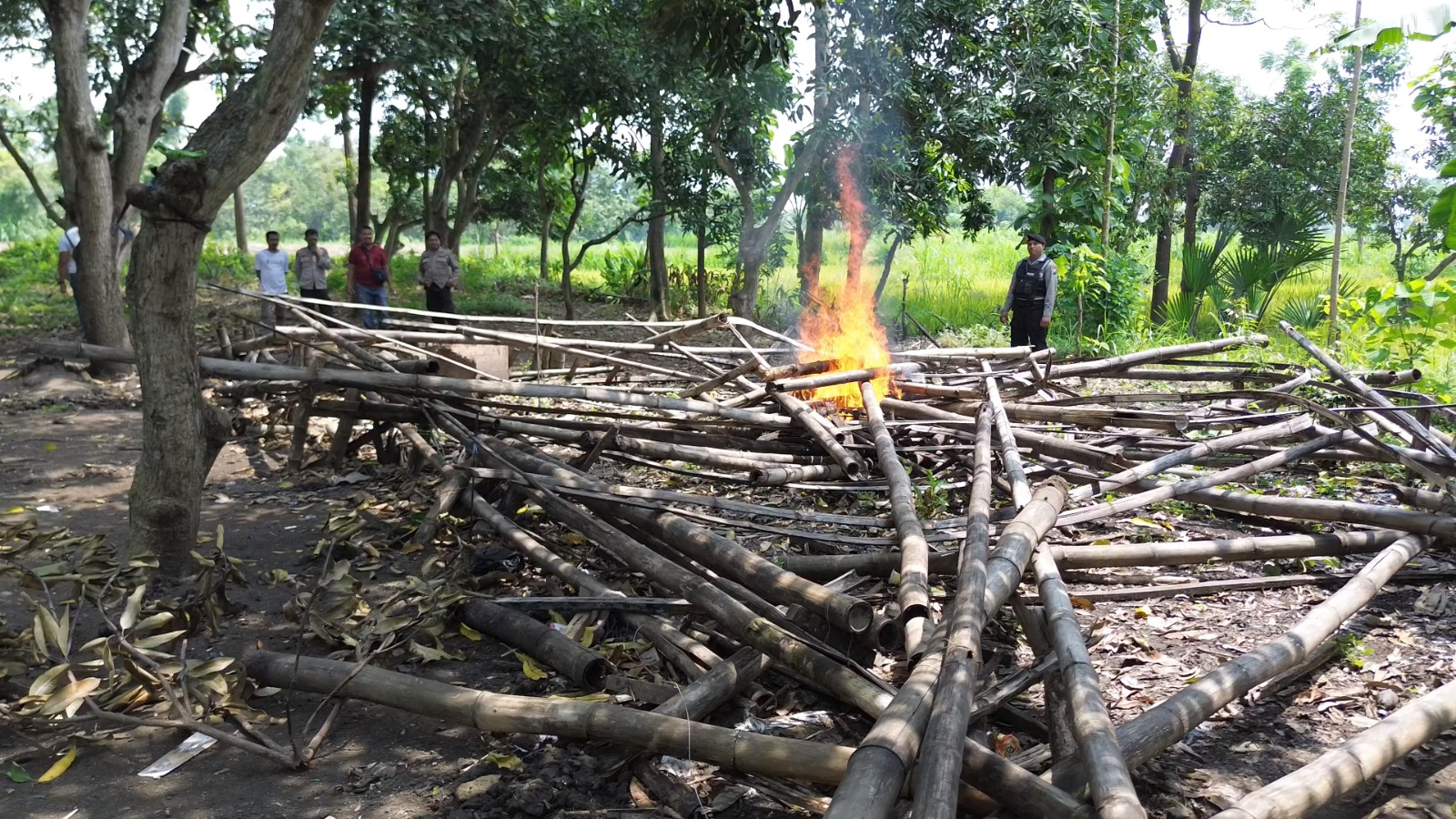 Setelah dilakukan pembongkaran, puing-puing bangunan dibakar agar tidak dapat digunakan kembali.