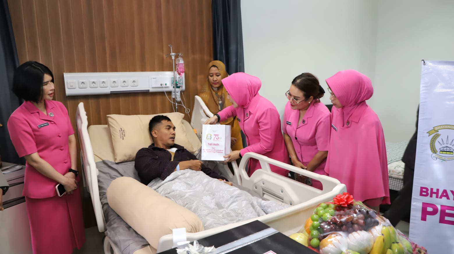 Wakil Ketua Pengurus Bhayangkari Daerah Jawa Timur, Ny Vitha Pasma Royce bersama empat perwakilan Pengurus Bhayangkari Daerah Jawa Timur (Ny. Silvana Robert, Ny. Wulan Dirmanto, Ny. Ayik Widiatmoko, dan Ny. Nana Suryo) dengan didampingi Ketua Pengurus Bhayangkari Cabang Kota Malang Kota menjenguk Bripka Hegy Triatha, anggota Satsabhara Polresta Malang Kota, yang masih tampak terbaring dengan pundak terbalut perban.