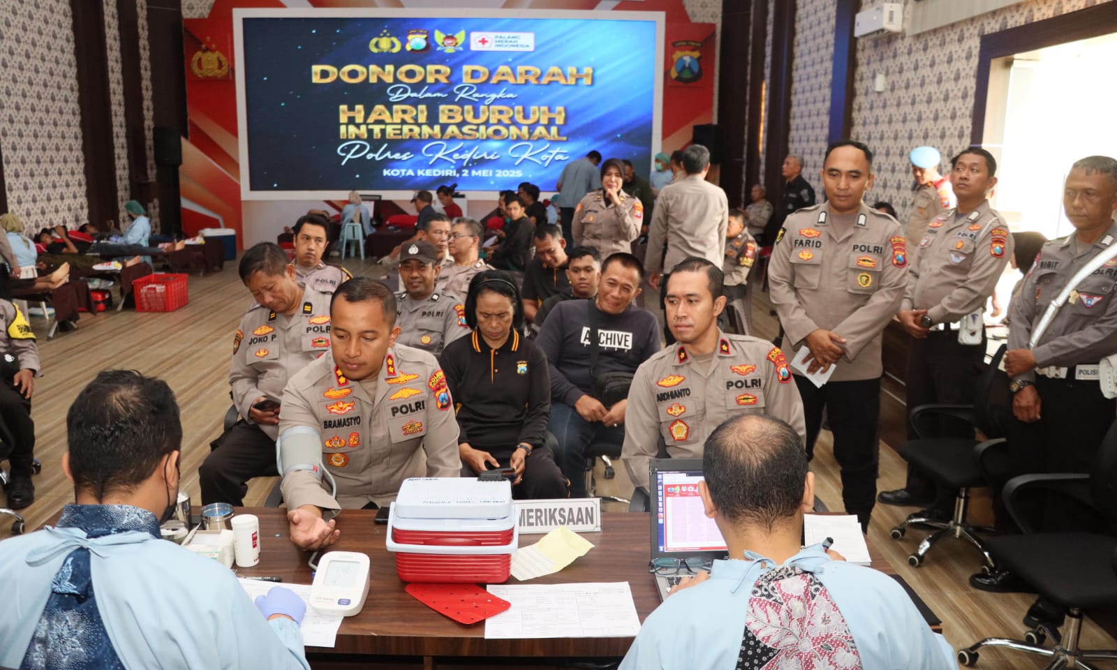 KOTA KEDIRI – Polres Kediri Kota Polda Jatim bersama serikat pekerja yang bekerja sama dengan PMI (Palang Merah Indonesia) Kota Kediri menggelar donor darah dalam rangka memperingati hari buruh Internasional, Jum’at (2/5/2025)