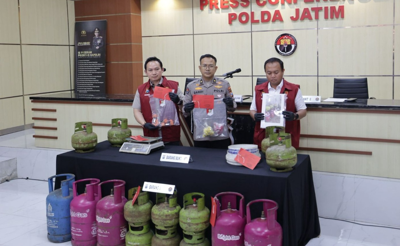 SURABAYA – Polda Jawa Timur (Jatim) melalui Direktorat Reserse Kriminal Khusus (Ditreskrimsus) kembali berhasil membongkar praktik ilegal pemindahan isi Liquefied Petroleum Gas (LPG) subsidi dari tabung 3 kg ke 12 kg.