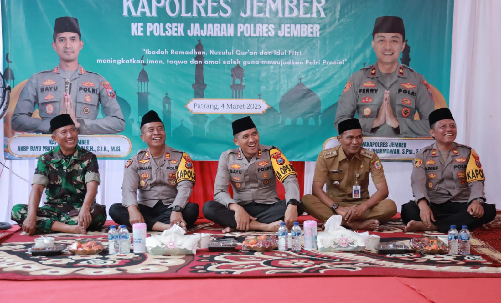 JEMBER – Hari ke Lima di Bulan Suci Ramadan 1446 Hijriyah, Kapolres Jember AKBP Bayu Pratama Gubunagi, S.H., S.I.K., M.Si., menggelar kegiatan Safari Ramadan perdananya di wilayah Rayon 1 jajaran yang mencakup Polsek Patrang, Polsek Arjasa, Polsek Kalisat, Polsek Jelbuk, dan Polsek Sukowono.