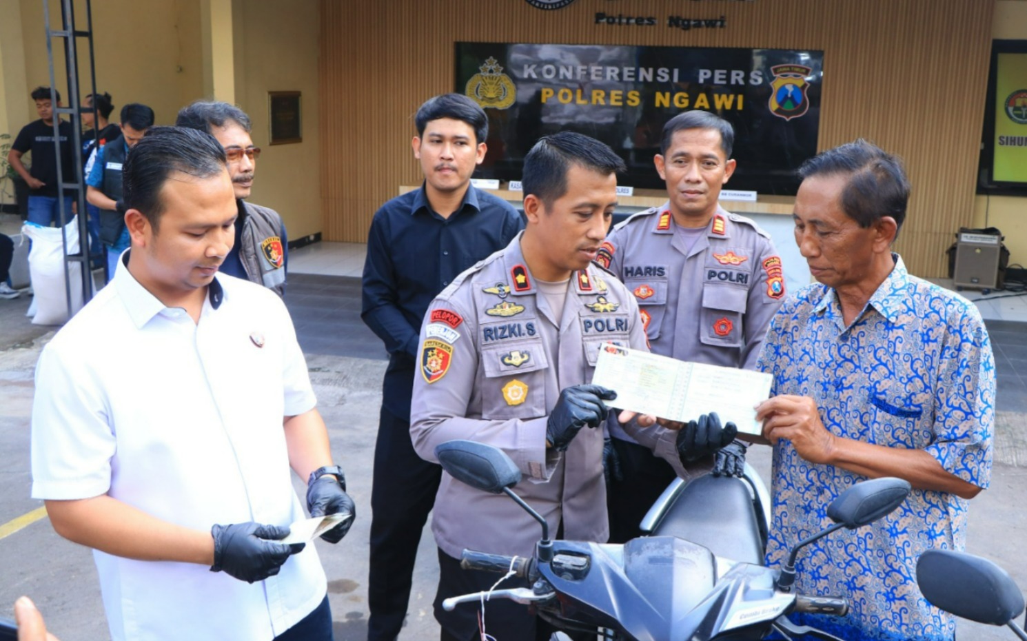 Setelah berhasil mengamankan tersangka dan menemukan kendaraan yang dilaporkan hilang, Wakapolres Ngawi Kompol Rizki Santoso, S.I.K yang didampingi Kasatreskrim Polres Ngawi AKP Aris Gunadi, S.H secara resmi menyerahkan barang bukti kepada para pemiliknya.
