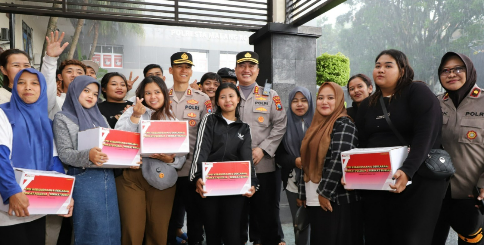 Sebagai bentuk kepedulian Polri kepada lapisan masyarakat pekerja/buruh, Usai Apel Kebangsaan, Polresta Malang Kota juga membagikan paket sembako ke setiap peserta serikat pekerja/buruh.
