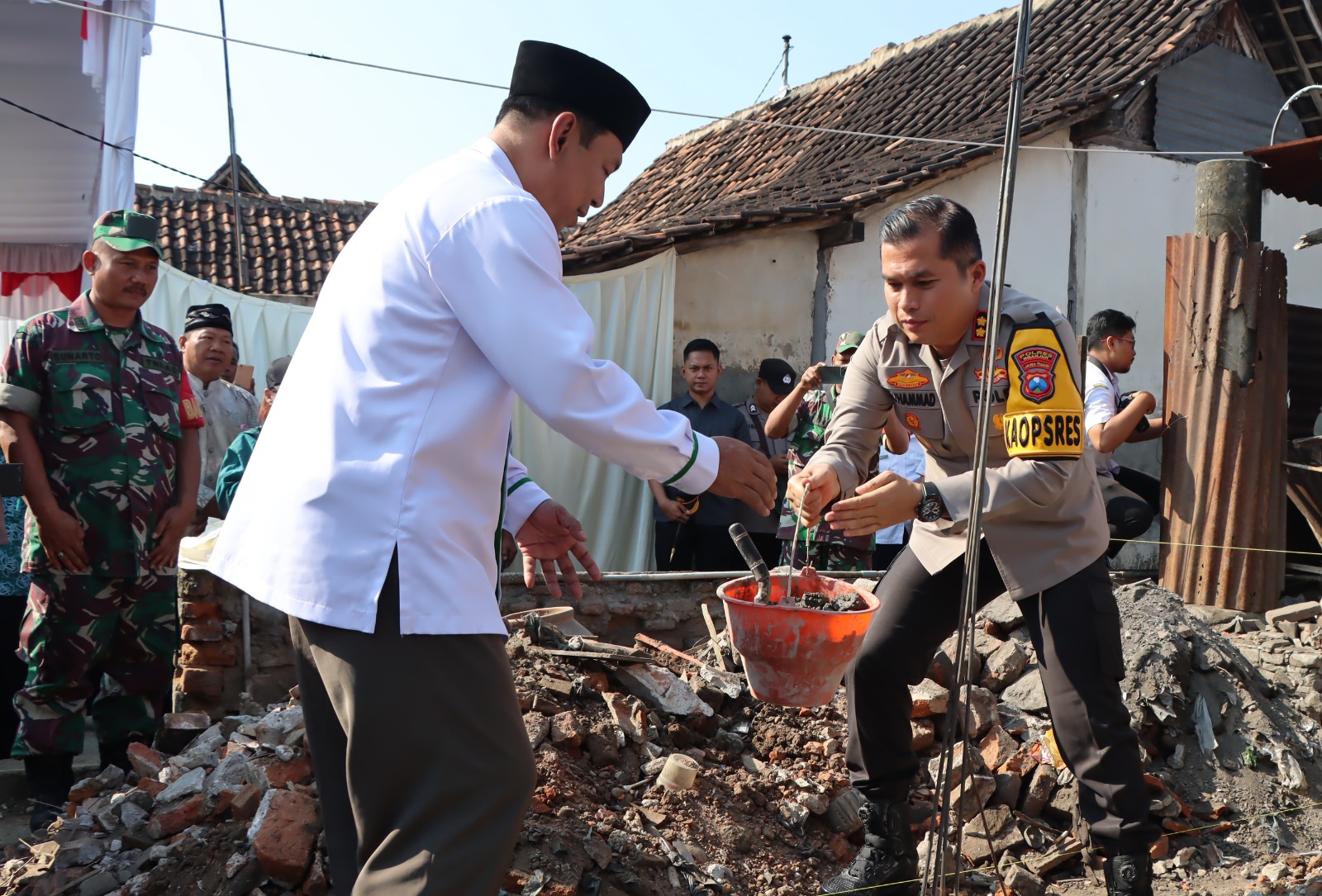 NGANJUK – Kapolres Nganjuk, AKBP Muhammad, S.H., S.I.K., M.Si., didampingi Pejabat Utama(PJU), para Kapolsek, Ketua Baznas Kabupaten Nganjuk serta unsur Forkopimcam Nganjuk dan pemerintahan kelurahan Kramat meletakan batu pertama kegiatan Program “Bedah Rumah”.
