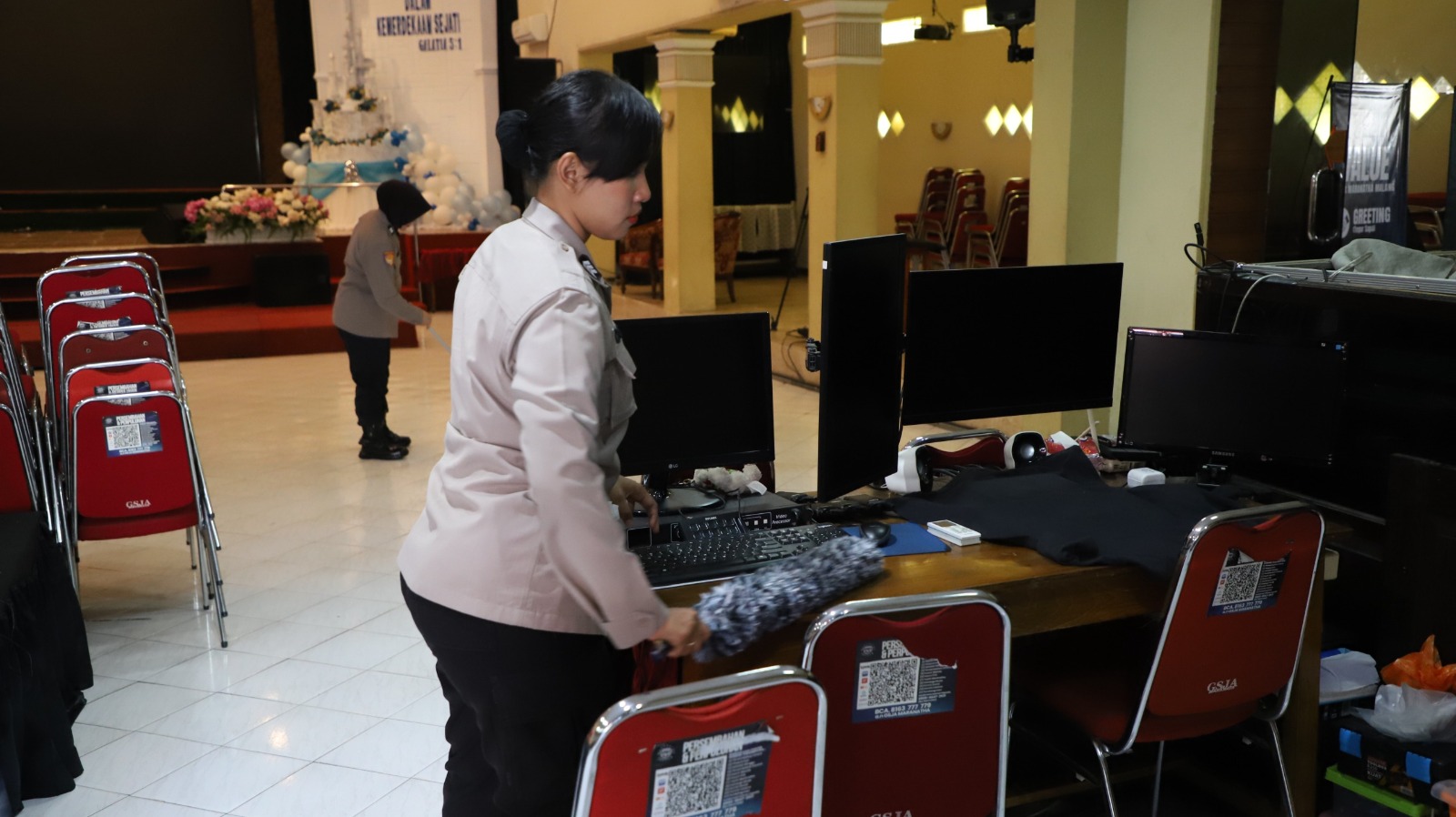 Masih dengan menggunakan baju Dinas, para Polwan mulai dalam hingga luar masjid dibersihkan dan dirapikan, dengan menggunakan peralatan sederhana seperti kain Lap, penyedot debu untuk karpet, sapu ijuk dan kain pel, untuk membersihkan lantai, kaca dan tempat wudu.
