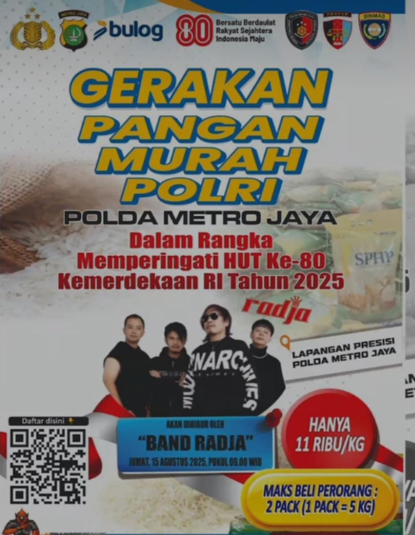 JAKARTA – Band Radja ikut memeriahkan kegiatan Gerakan Pangan Murah (GPM) Polda Metro Jaya, Jumat (15/8/25) besok.