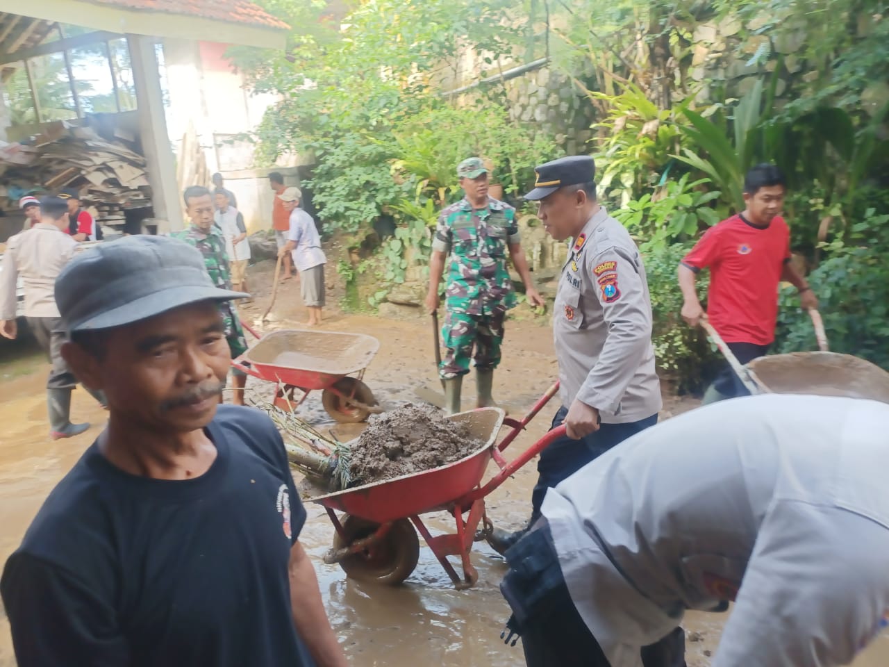 Sinergitas, Polisi Bersama TNI dan Warga Gotong Royong Bersihkan Material Longsor di Trenggalek