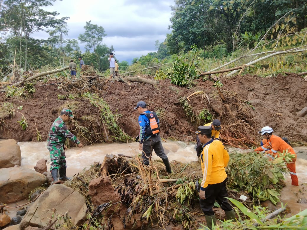“Dampaknya dapur di rumah warga menggantung akibat tanah tergerus air luberan longsor. Sekarang sudah ditangani darurat dengan penyangga bambu,” terangnya.
