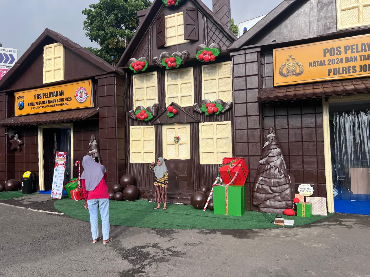 Posyan yang dibangun oleh Polres Jombang Polda Jatim ini disulap menjadi bangunan wahana rumah cokelat agar membuat nyaman pemudik yang singgah beristirahat.